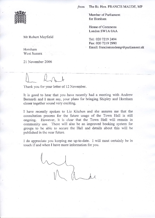 A vision of what is possible where buildings such as the Horsham Town Hall is concerned is set out in this extract from Francis Maude's weekly Francis' Footnote in an edition of the West Sussex County Times in 2006;
